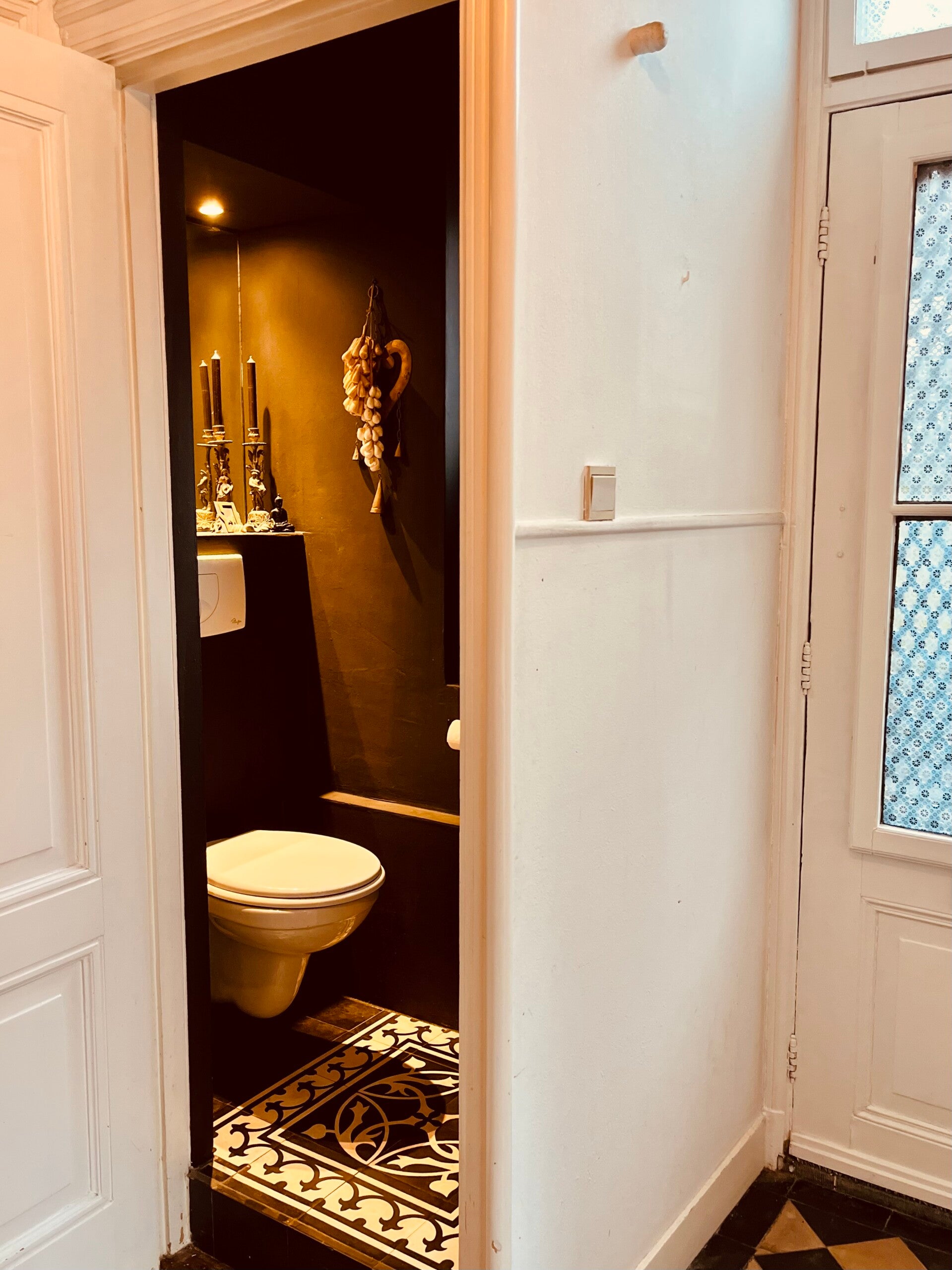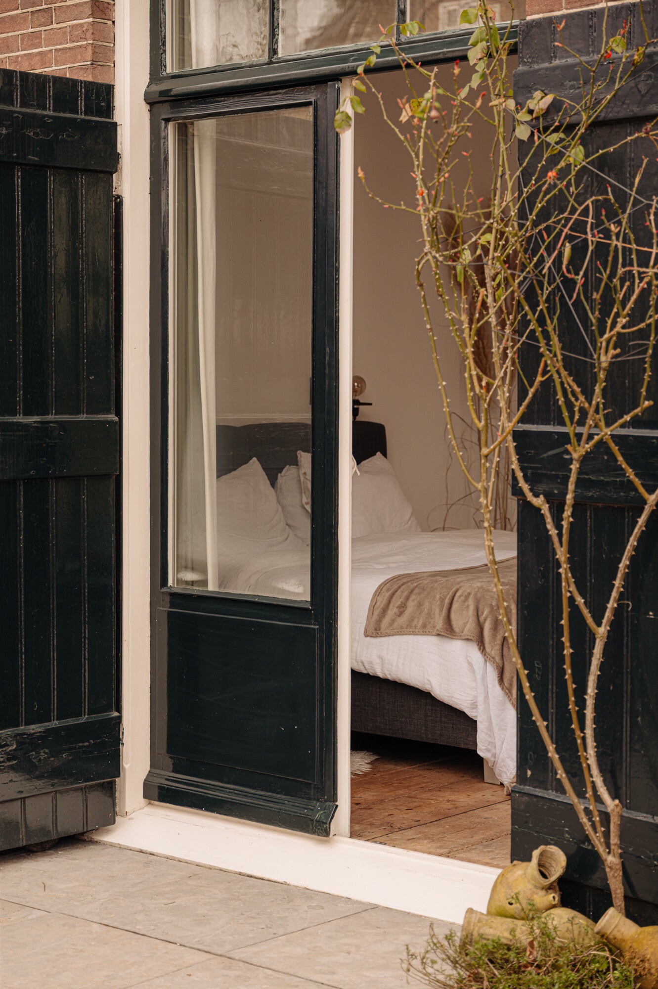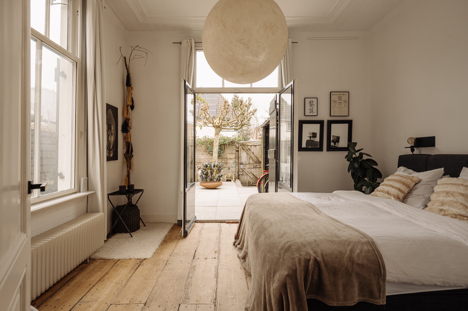 Aan de voorzijde van de woning ligt een sfeervolle en ruime slaapkamer met hoog plafond en openslaande deuren naar de tuin, voorzien van luiken aan de buitenzijde. Een fijne, rustige plek die het huis uitermate geschikt maakt voor gelijkvloers wonen.