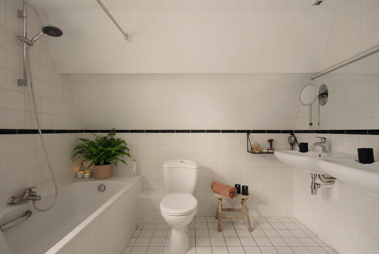 De badkamer bevindt zich aan de achterzijde en grenst aan één van de slaapkamers. De badkamer is praktisch ingericht en voorzien van alle benodigde sanitaire voorzieningen. Vanuit hier is er directe toegang tot het zonnige dakterras. Achter de hoge kastdeuren zijn de aansluitingen voor wasmachine en droger, de moderne c.v.-ketel en veel bergruimte netjes uit het zicht geplaatst.