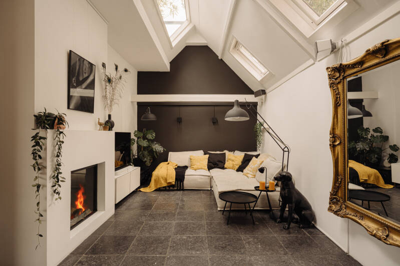 De living op de begane grond is licht, ruim en uitnodigend met fraaie balken aan het plafond. De comfortabele zithoek met gashaard vormt een fijne plek om te ontspannen. Dankzij de serre aan de voorzijde en de diverse daklichten stroomt het daglicht rijkelijk naar binnen. De woonkamer is afgewerkt met gezoete natuurstenen tegels met vloerverwarming; de begane grondvloer is volledig geïsoleerd.