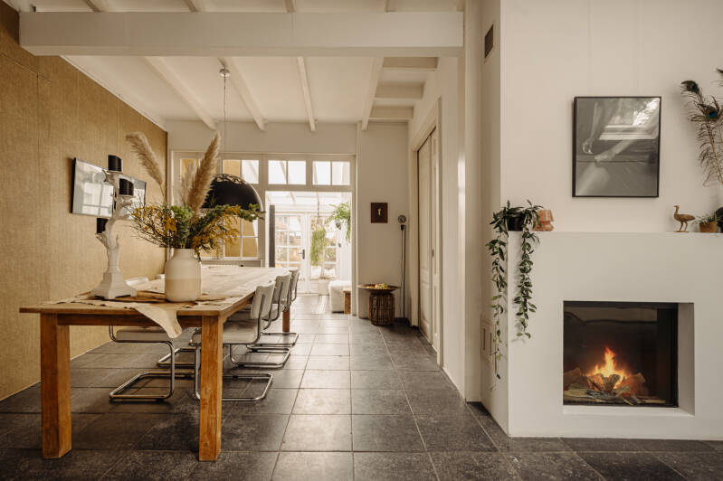 Het eetgedeelte staat in open verbinding met zowel de keuken als de serre en tuin, waardoor binnen en buiten op een natuurlijke manier in elkaar overlopen.